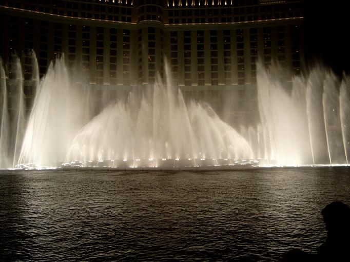 Toto je fontana pred hotelom Belagio. Asi najkrajsia fontana vo Vegas. Voda striekala do rytmu a Celine Dion do toho spievala hit z Titanicu (iba z pasky). |