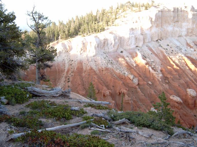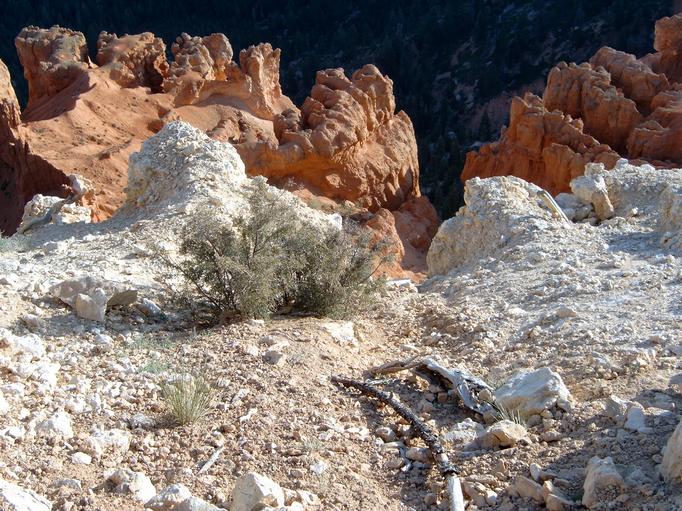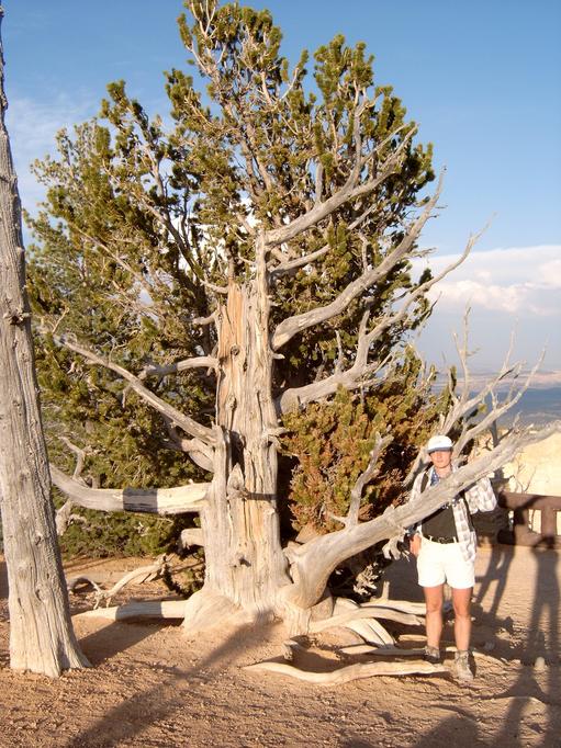 Tento druh borovice sa vola Bristlecone Pine. Ked je sucho, vie vypnut privod zivin do niektorych konarov, tie uschnu a ostatne preziju. Tato uz zije 1600 rokov. |